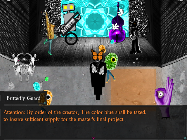 This world manifests in a collage art style, sprites and environments strung together with cut up images. Each world sticks to a general theme with their worlds. The first realm of Anxiety is mainly green and black, having a pop-art feel to its world while the realm of Logic utilizes diagrams and scientific looking images and is all blue, the color of smart people in pop culture for some reason. Having a general theming to the contents of the visuals of each world grants a sort of cohesiveness that makes the game feel like a unified vision instead of just a bunch of stuff thrown together.