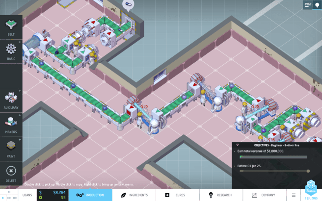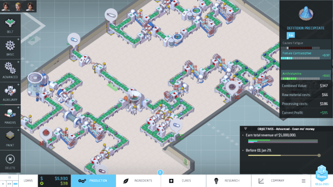 The core experience of Big Pharma has you setting up chains of conveyor belts and machines to process raw materials into medicine. Materials pass through machines that change their concentrations, and entering a certain range can activate positive and negative effects; of course, you’ll be wanting to manipulate the concentration to prioritize the positive effects. As you expand your factory and the machines you can use, Big Pharma becomes a bit of a puzzle game where you try to figure out how to optimally set up supply chains to be space and cost efficient. Building a successful chain of machines that gives the medicine you want feels great and seeing that chain in motion on fast forward is just satisfying.