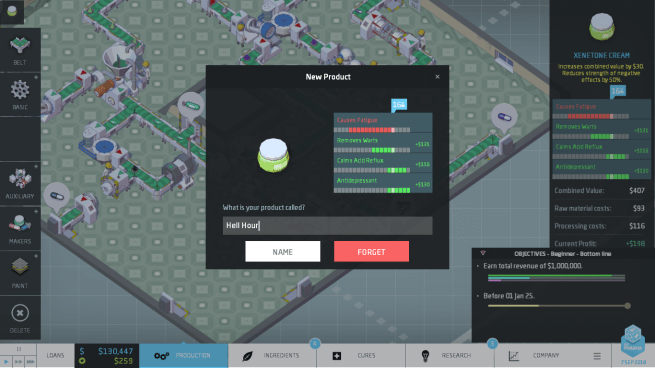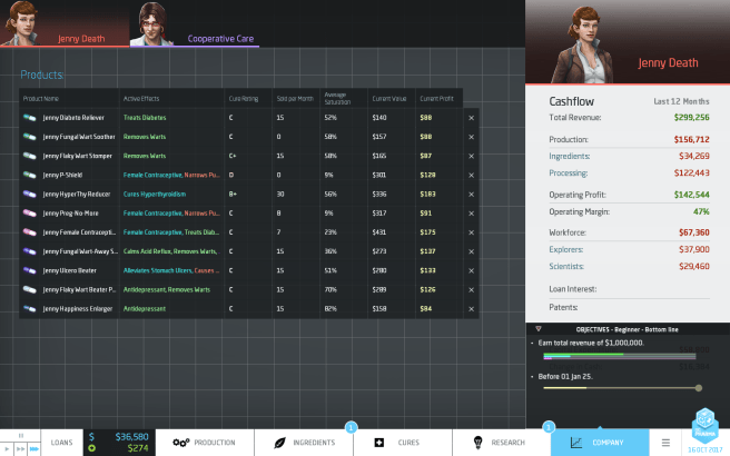 Anyway. I played enough of Beginner and thought, “alright, I feel that I’m set,” so I hopped into a level of Advanced, which bills itself as the way the game’s intended to be play. I then remembered a big reason why I’m not into tycoon games very much outside of sandbox mode – I am a huge idiot. The Jenny Death industry is run by a dumbass, folks.This is not a knock against the game, it makes its rules and risks pretty clear (even if I’m not into the patent stuff), I’m just really bad at long-term planning, which is a general problem I have.