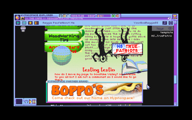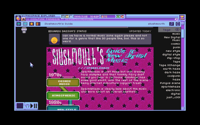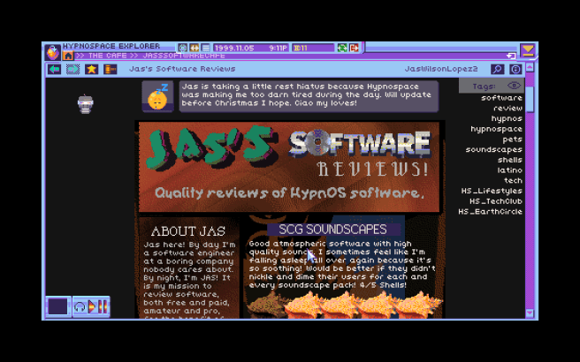 And the music, it’s real good. You’ve got catchy commercial jingles, you’ve got stuff from a hip-hop analogue, etc. People lose their minds over tumblr blogs having autoplaying themes but here, it’s cool – I will not get tired of that fantasy rock song about shaving. There’s a surprising number of tracks in the game and some of them don’t seem to show up in normal gameplay – gotta buy it yourself. I don’t know if music was a big deal for Geocities and I wasn’t around for Myspace – which fucking, by the way, lost everything – but it’s something that helps define the Hypnospace experience, with music often defining its users as much as their content.