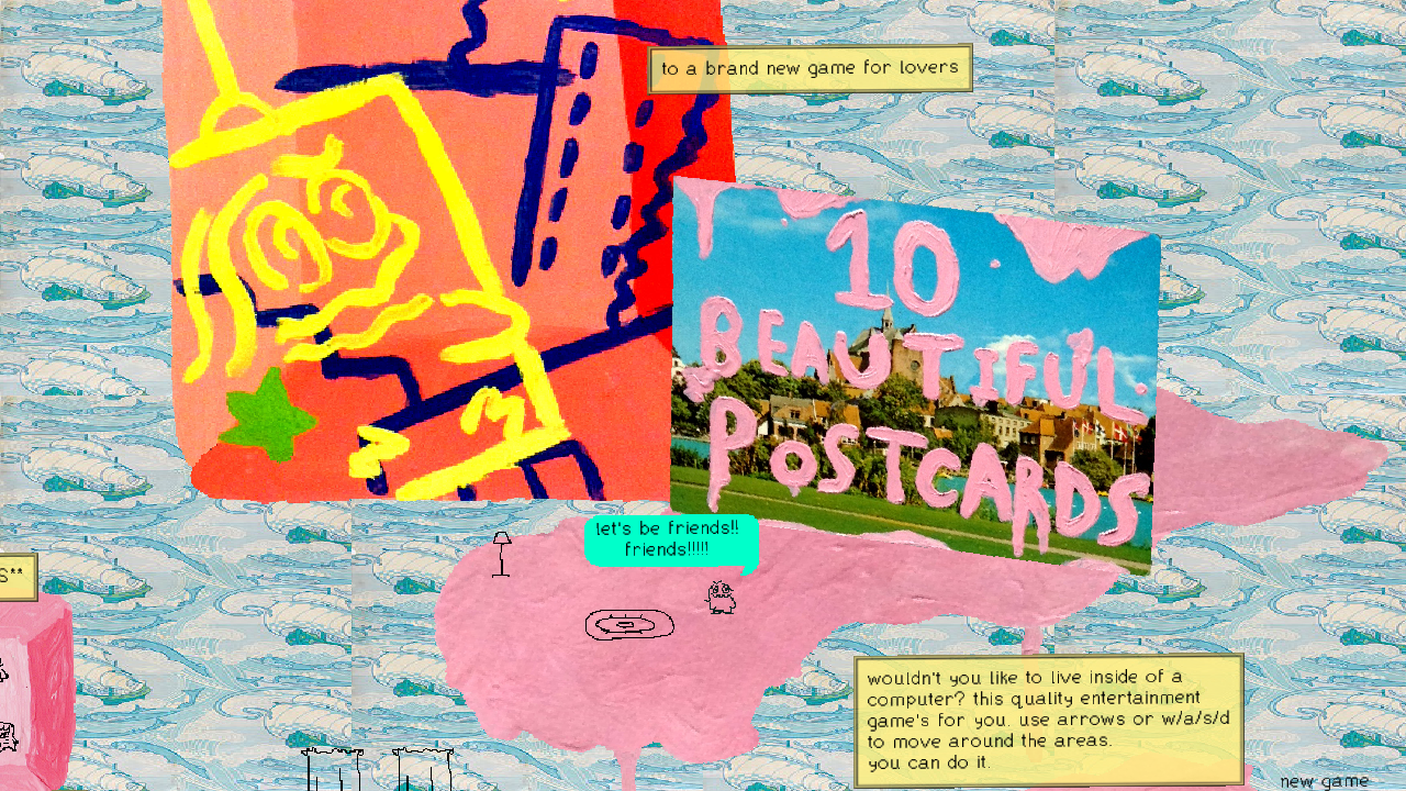 Thecatamites’ collage stylings has evolved to its truest form with this game. 10 Beautiful Postcards feels like checking out 50 Short Games again, except the art style shifts between areas rather than separate games. Small pixel drawings run around areas that seem to have been drawn out in an art program, while others have you running around in an area constructed with felt marker drawings. Some areas are blatantly just drawn on a piece of paper that’s scanned in, taking the game’s imagined walls to its truest conclusion. Occasionally the game breaks out of the free roaming flat land wandering to switch to a travel section with 3D models, which is more in line with works like Magic Wand. Thecatamites’ past games have always felt disorienting and chaotic, but 10 Beautiful Postcards really takes the cake.