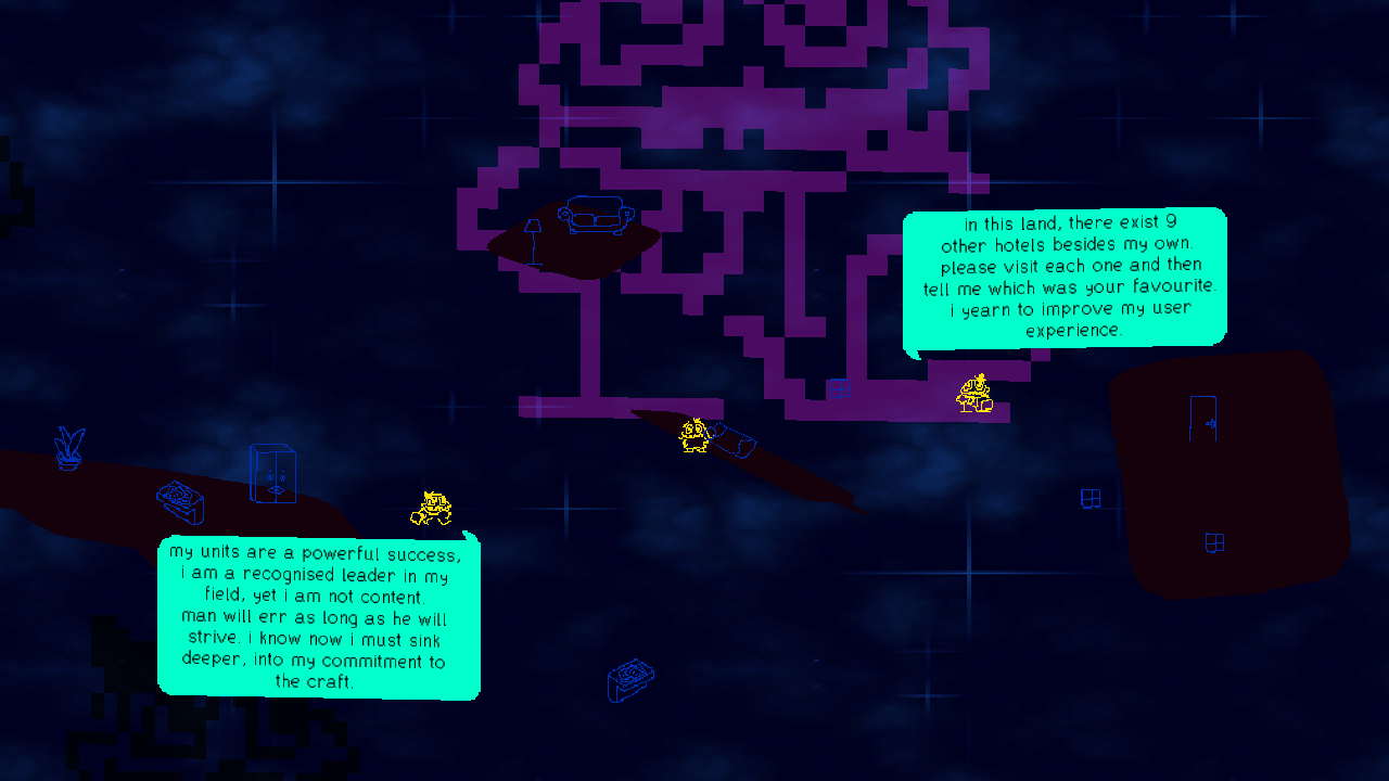 With that in mind, the stuff you find on Mr. Hotel throughout the game can be seen in a different light. Mr. Hotel is not a quirky fellow with a dream, but an Elon Musk: a quirky fellow that’s actually an embarrassing asshole.