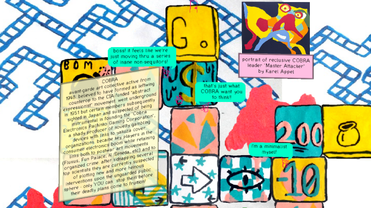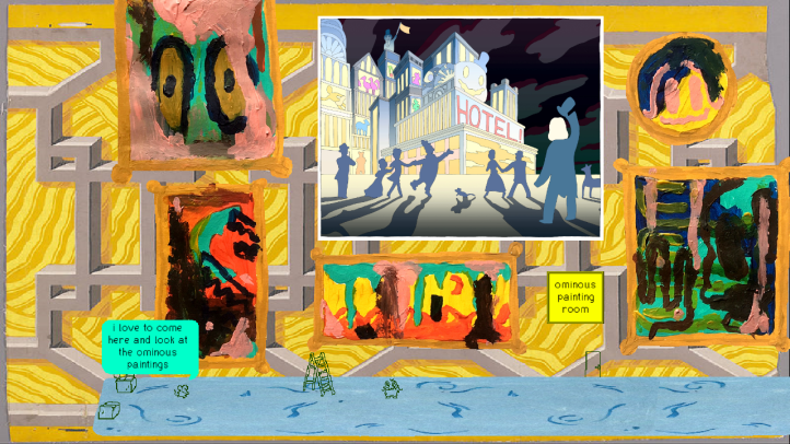 On the art side, thecatamites has also collaborated with Alex Degen, a comic artist with Koyama Press. This collaboration has taken the form of what the game dubs as “ominous murals,” and not going to lie, they always feel ominous. They look like art that you’d find in some hotel lobby or a public building, and all of them contain a ghostly banker-like figure; I forget whether or not it was explicitly stated, but I think it’s Degen’s version of Mr. Hotel. This ominous rich fellow is found everywhere, his dark presence of commerce always felt.