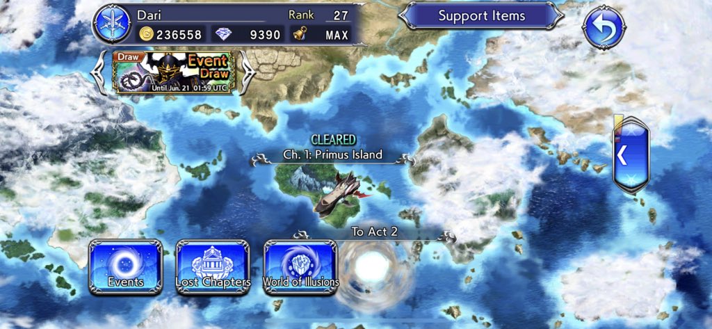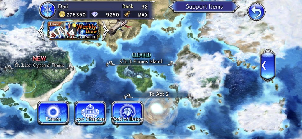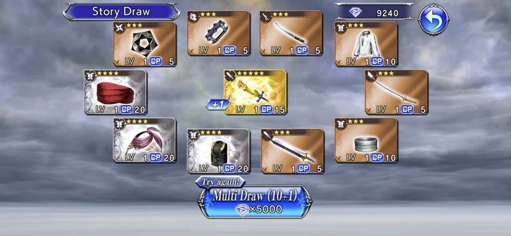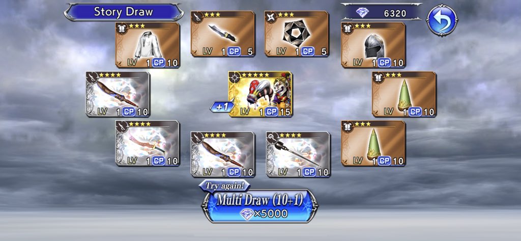 Anyway, during all this, I took two pulls on the Kefka, Bartz and Tifa banner, because if Tifa’s going to roll with me I need to have an actual good fist weapon. Unfortunately, I didn’t get it. I managed to get Bartz’ advertised sword and a decent 4-star weapon that synergizes with Zidane. I also got a headpiece for Kefka, which is bizarrely his weapon type? Do they enhance his magical powers? I don’t know. There’s a lost chapter that will unlock Kefka for me, but I’d want to meet up with him in the story first.