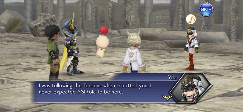 In their wanderings, Zidane and Hope feel that the ruins they’re in are familiar, despite both being from completely different places. Everyone’s like, “huh that’s weird, we should ask Mog about that.” It’s then that a whole bunch on Opera Omnia‘s setting is revealed. The main world of Opera Omnia is actually an artificial world that was crafted based on ideal experiences from other worlds, which is also why there is no OCs running around in this world. However, if this world is corrupted by the Torsions, its corruption will spread into other worlds, like a Plato/Space Funeral City of Forms scenario.