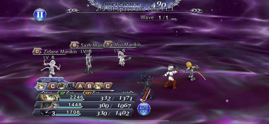 Kuja is there doing… things. He doesn’t like the heroes hanging around and so he sicks manikins on the crew! If there’s one thing I love in games, it’s mirror battles against doppelgangers or people that stand on the same level as you. Manikins take the form of heroes that you can conceivably have at this point and can use their abilities. This also might include ones that you may not have yet, because I saw the Tifa manikin use a Battle Cry to heal and buff herself? Anyway, I recommend taking out Warrior of Light mankins first whenever possible because their shield ability will prolong any fight, even if you’re busted.