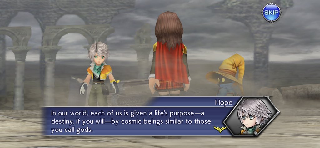 For no real reason Rem starts talking about fate to Hope and Vivi and they all shoot the shit. Rem talking about the nature of death in her world is actually the first time I’ve learned anything about Type-0 and it sounds kinda wild? Anyway, they speculate that the reality altering powers of the Torsion could give the power to change fate and think that’s what Kuja’s gunning for.