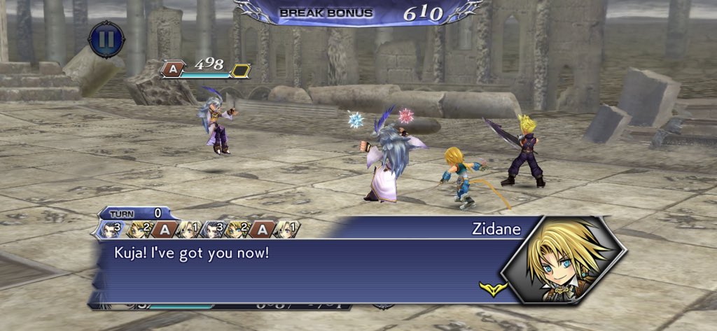 The group finds Zidane talking to good ol’ Kuja, who turns out to have the ability to create Torsions to teleport around and unleash monsters. Vivi and Zidane chat things up, Zidane hits on the girls currently in the party, and joins the crew. Zidane’s first power is Stellar Circle, which also allows him to decrease somebody else’s speed while buffing his own.