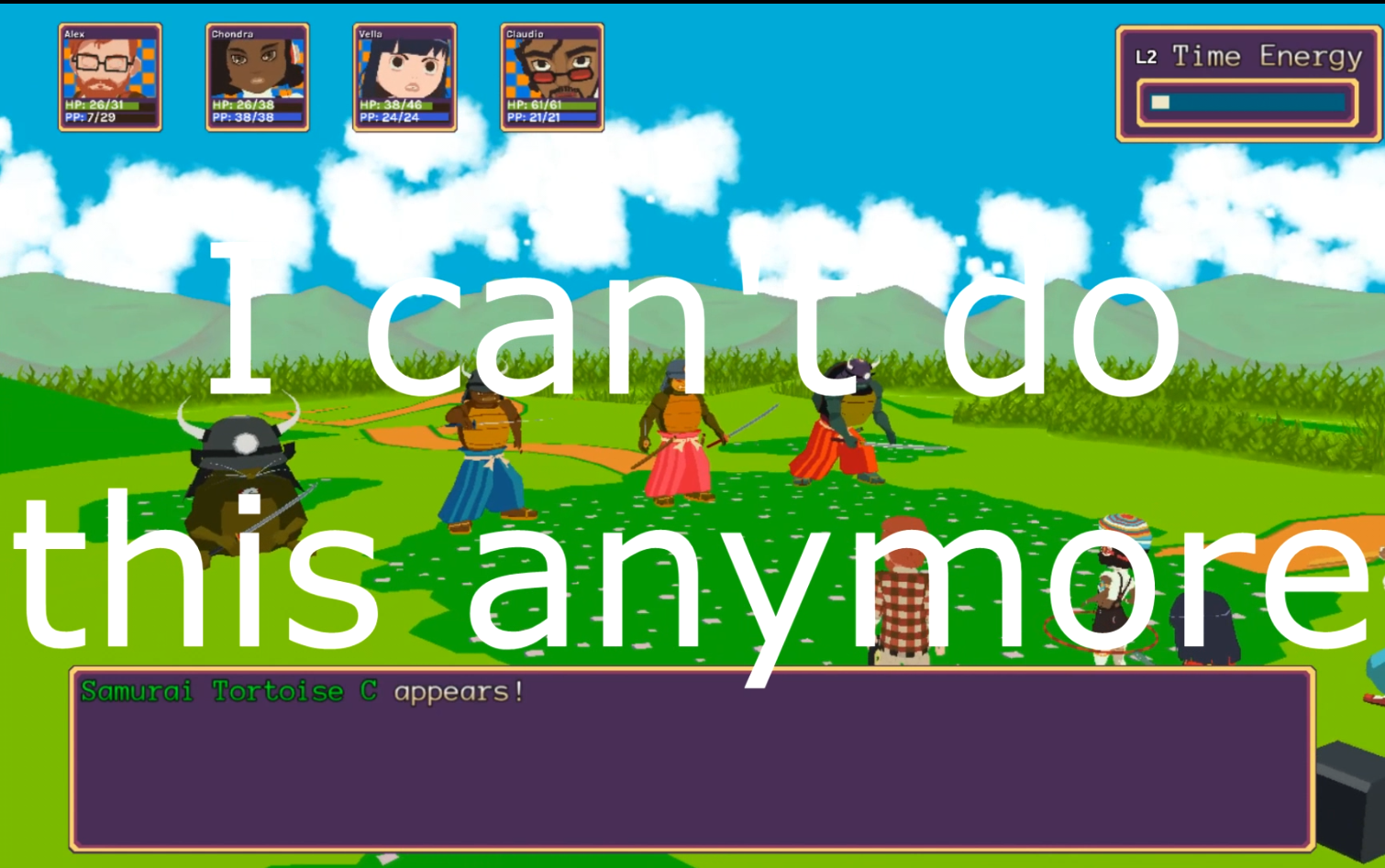 I regrettably ran into encounters on the world map, and the encounter that truly broke me and destroyed my soul was the encounter with four enemies, all of them scaled up to my level. I take half a minute to do Alex’s attack on a rat and it didn’t even get it close enough for another character to kill it. There is actually a couple minutes cut from the video where nothing happens because I was genuinely so upset that I left to lay down for a few minutes.