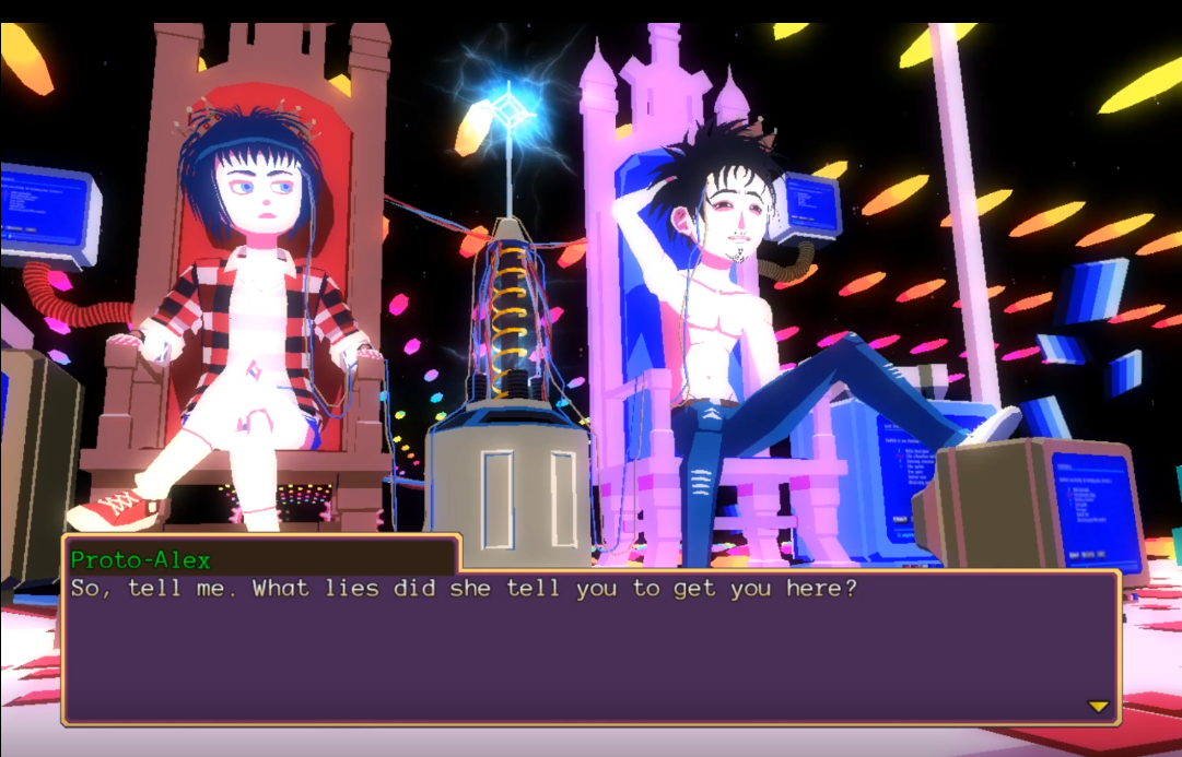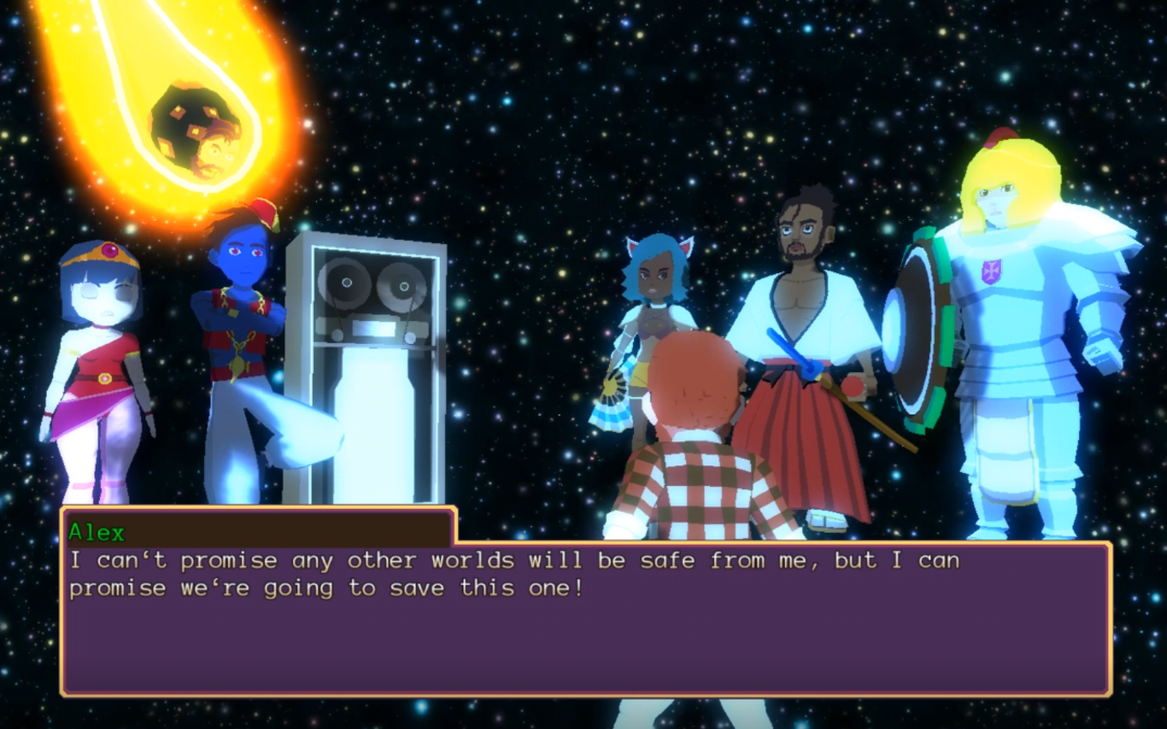 And so, the name selection at the beginning finally pays off. Alex appears on a modern day television owned by “you,” his parallel self and it turns out that all of his monologuing was him telling you a story. But also, that doesn’t fully work because some of Alex’s narration only works under the assumption that “you” can see what he sees; like at the beginning of chapter 3, he talks about the Soul Survivor in his house as if you can also see them. Whatever, post-modernism, baby. Your Alex apparently accepts what’s going on and decides to squad up with their set of friends.