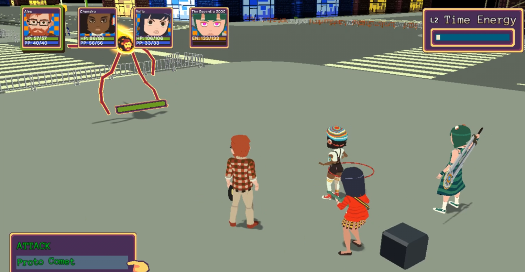 …this. This is the climactic boss of the game. It’s so fucking bad. Instead of keeping it as a big meteor (excuse me, comet), the Proto Comet shrunk to be as big as the party members and it has wavy arms and legs like those inflatable things on car dealerships, destroying whatever sense of danger this thing had. The Proto Comet is extremely lame and it’s only highlighted by the music, which is genuinely the worst track in the game. It tries so hard to be a Persona boss theme, but it forgot that the lyrics are supposed to be used more for aesthetic, so it’s extremely melodramatic. This is somehow lamer than P3‘s Strega fights, I can’t believe YIIK took a world destroying threat and made it suck ass in every way.