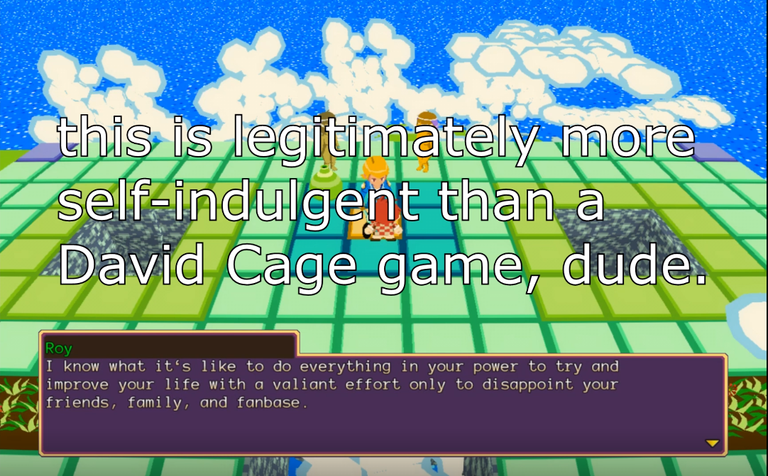 Roy gives Alex a pep-talk that also simultaneously acts on a reflection of Two Brothers, which is final confirmation that Ackk Studios lives in an echo chamber. Roy says that “some people have worked really hard to prevent me from finishing my quest.” Yeah, that’s the developers themselves. Ackk Studios was doing a remake of Two Brothers called Chromophore, but it ended up getting abandoned as development shifted to YIIK.