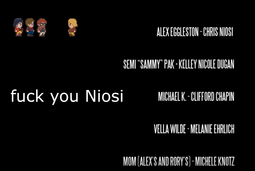 This reveal legitimately means nothing because: one – Alex says fucking nothing about it and two – Claudio and Chondra, the two characters that would actually be invested in this revelation, are fucking dead. There’s just no pay-off. What annoyed me even more about this reveal is that essentially, the only three black characters exist for the sake of Alex’s mysterious nature. Thanks YIIK, very cool.