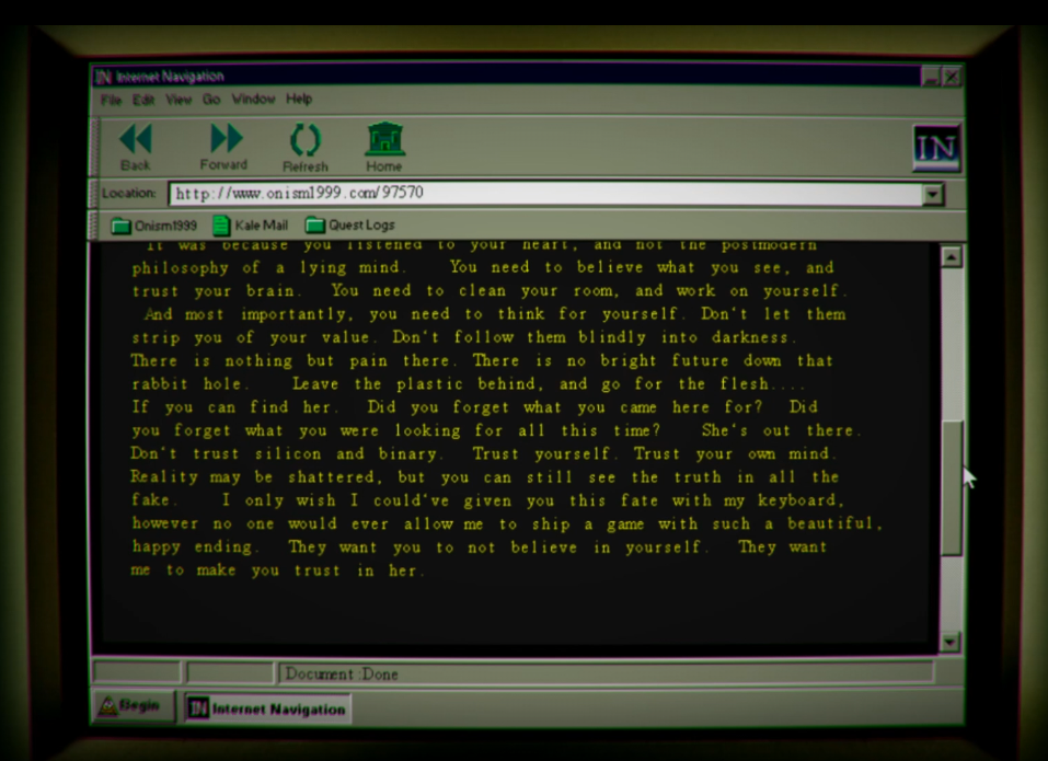 Instead of going to New York at the end of Chapter 5, you can hit up the computer to read an e-mail written by one of the Allansons that’s all like, “my sweet boy, here’s an ending that ignores post-modernism and also don’t trust that woman that we’ve written, bye.”