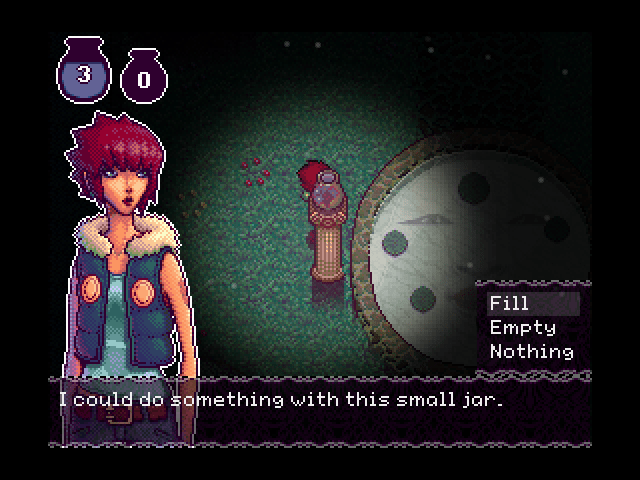 Gameplay wise, yeah, it’s one of those puzzle adventure RPG Maker games. The game’s lowest point is the hedge maze in the second act, which commits the crime of not just being a maze, but it also teleports you around. The high point is easily the central puzzle of the final act, which has you restarting events with you gaining items and seeking variations on the repeating loops. It’s an interesting puzzle and it’s one that I think works thematically, because it feels like the protagonist living through a bad day over and over, contributing to her ultimate goal of coming to terms with her past.