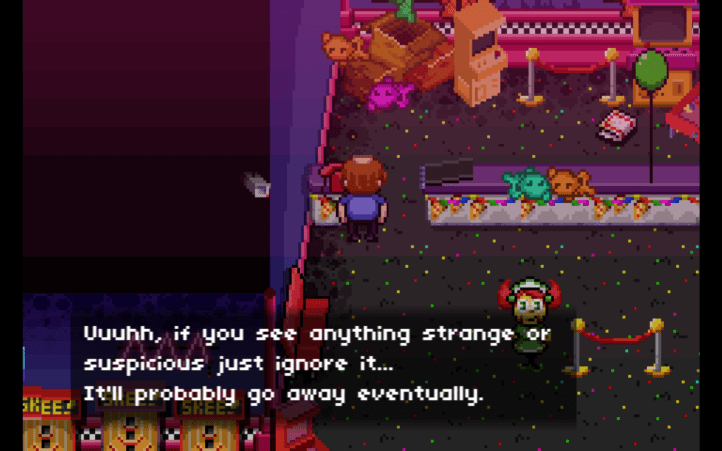 It’s late at night, all the guests are gone. Stezzoni Pizzeria is a wreck of plates and trash. Your only companionship are the animatronics and the faint buzzing from the arcade. Huh? Will the animatronics attack? Nah, most of them are cool with you. This ain’t a Five Nights at Freddy’s.