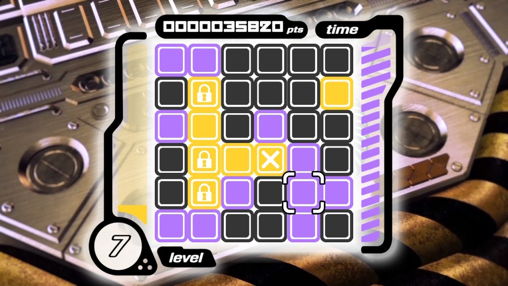 To create crosses, you scroll a row or column across the screen to align tiles. The tiles also wrap around the screen, so you should always keep scrolling in the other way in mind if there’s something preventing you from scrolling forward. What’s exactly stopping you? There are occasionally tiles with locks on them that prevents you from screen wrapping when they hit the edge of the playing field. There are also tiles with “X”s on them that are way more dangerous in that you can’t move a row or column that has one on it. It’s mildly annoying, but it quickly becomes debilitating if there’s multiples on the screen. You can however break these bad tiles by creating a cross with them or creating a cross right next to them.