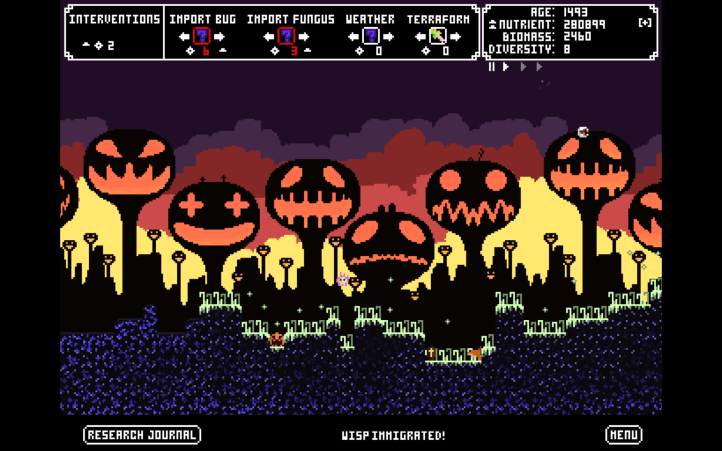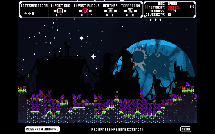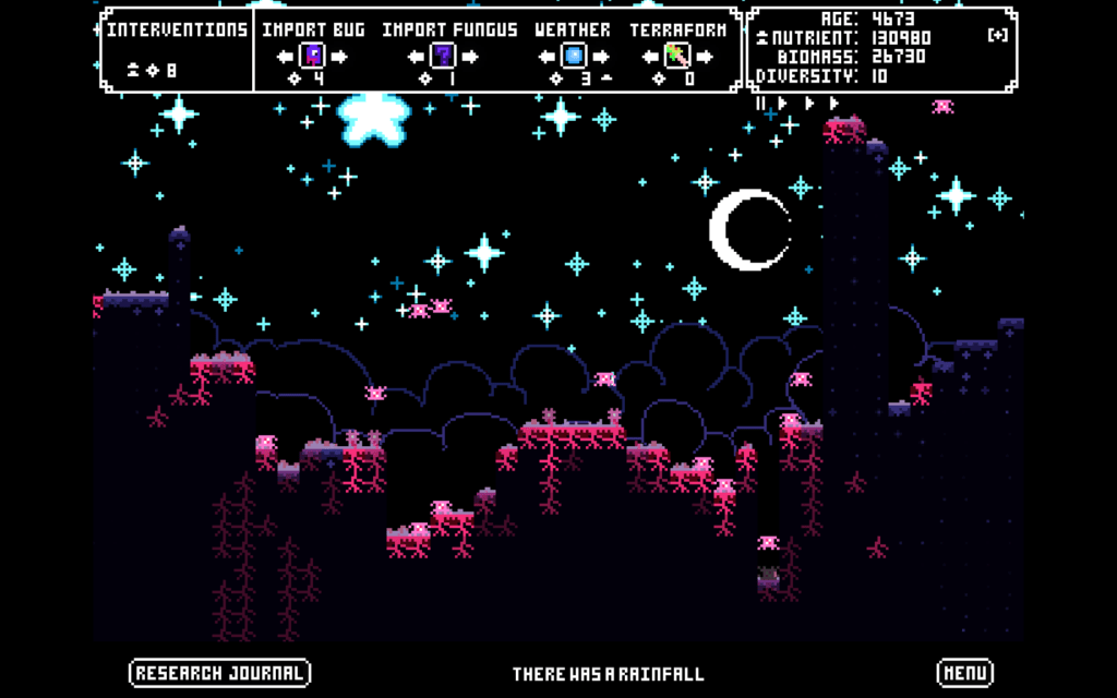 For a simulation game, you actually have very little power. After a certain amount of time, you earn points that allows you to make interventions to the ecosystem, either introducing new insects or fungi or creating weather. At times, this may be required. For instance, you have a lot of herbivorous insects but they’re going through plant-life really fast, so you may need to quickly introduce a carnivorous insect like a mantis to keep things afloat. Besides the resource based interactions, you can click and drag living creatures to bring them to areas of the map that could better sustain them or save them from predators.