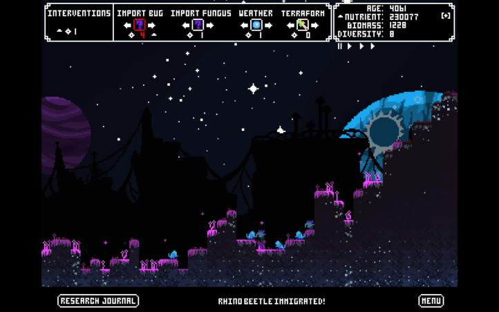 When I first played, I had a small population of rhino beetles feeding off of this pink mold. A species of snails once existed alongside them, but they died out, presumably because the rhino beetles ate up all the food. To the side, a species of spiny slugs tried to thrive but eventually died out, living long yet lonely lives. I played around, looking after smaller species off to the sides, until I eventually racked up a lot of intervention points.