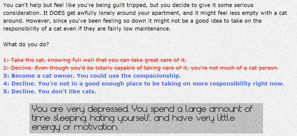 There are some divergences and choices that open up depending on how you navigate this life. Most importantly, you can seek the help of a therapist regardless of how ashamed you feel and take medication, even if it has debilitating side effects. I followed these choices and expanded my social network with friends and a nice new kitten, leading to the closest thing to a “golden ending” this game has to offer. An important takeaway though is that even in this golden ending, the bad days don’t go away. As a whole, life just becomes more manageable – but it’s better than the worst case scenario.