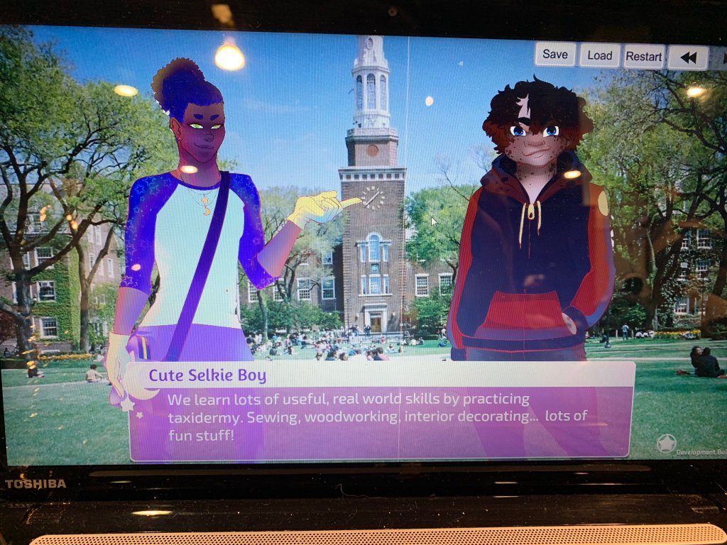 The game started out pretty rough, in that my character just dies in one hit, in spite of having a health bar. My sister and I took turns with it, got frustrated, and told the developer (not sure who it was, sorry, didn’t ask 😦 ) about it. As it turns out, somebody set the game’s difficulty to “impossible” as a prank. And honestly? Owned, it was a pretty good prank.