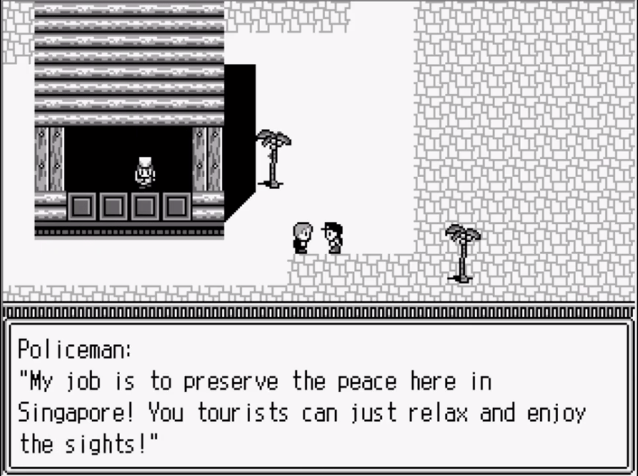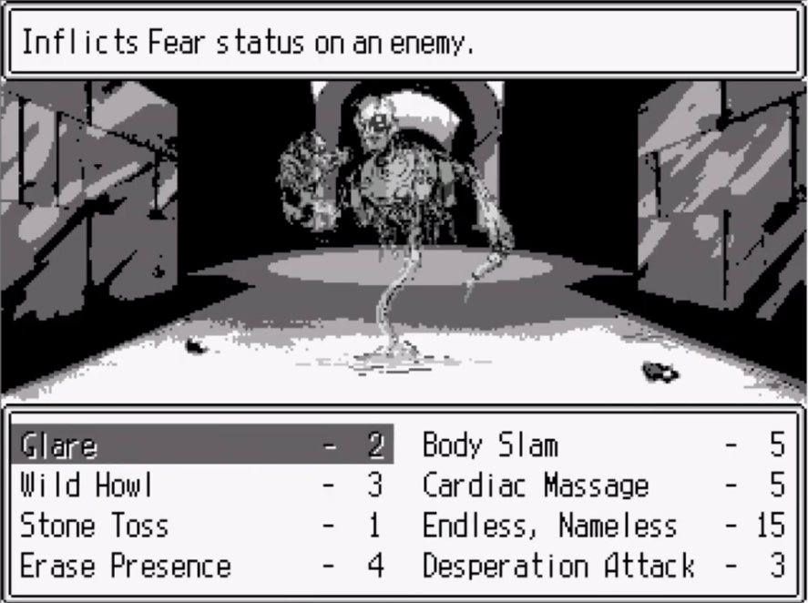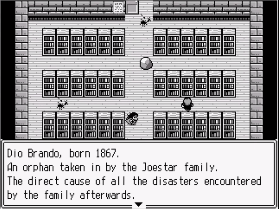 As for the aesthetics of the game, it looks fine. The game is meant to look in line with Gameboy RPGs. In particular, it’s reminiscent of Final Fantasy Legend, which is actually a SaGa game, which is a series that the creator seems to love as the developer room indicates. Outside of the overworld sprites the art seems to be a combination of what looks like scanned art (or very good recreations) and original designs. I’m looking back at that Stand guide I transcribed and yeah, a lot of those designs are baller. Napalm Death? Exquisite. Red Garland? Love it.