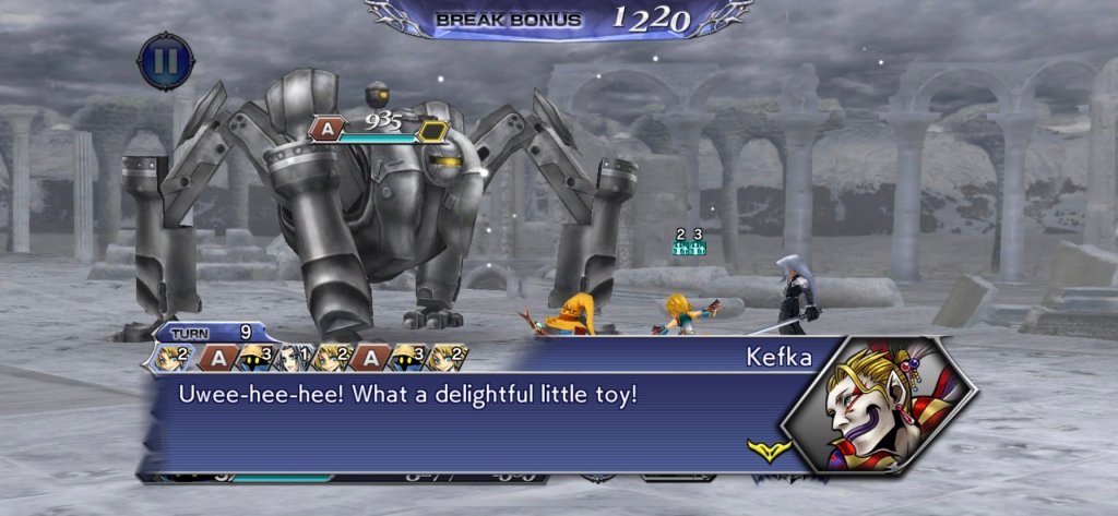 Speaking of whomst, our heroes have caught up to Kefka. He sics a huge mech on them that acts as the chapter’s final boss. Surprisingly, Kefka is thrilled to see the gang trash his robot and close the Torsion. As it happens, his goal isn’t to rip apart reality with the Torsions like what was initially thought. His actual stated goal is to just fuck around and see what happens. Truly, the Joker of gamers.