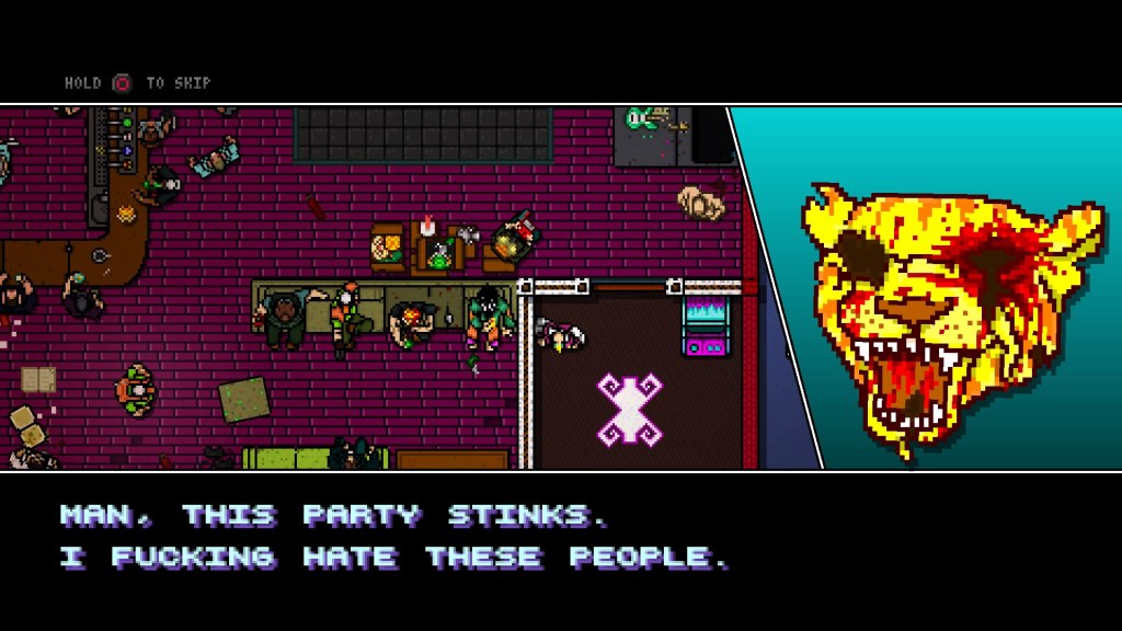 The original Hotline Miami presented itself as a fever dream of a catatonic man (dubbed Jacket), violence lost in the haze of thumping music. Richard – the personification of the chicken mask – judges Jacket’s actions and in a way, he’s questioning himself.