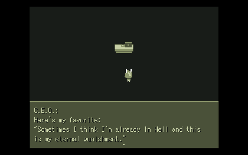 Hey bud, welcome to your new job! Ah, don’t be shy, we’re all family here, just uh, make sure you fit in, alright? Here’s a handy PDA so that we can easily keep you informed on tasks – aren’t we kind? Hm? That dead body in the hallway? Bah, don’t mind that, the janitor will deal with it later. You should just ignore it, you wouldn’t want to be rocking the boat, don’t ya? Haha, anyway, again, happy to have you aboard!