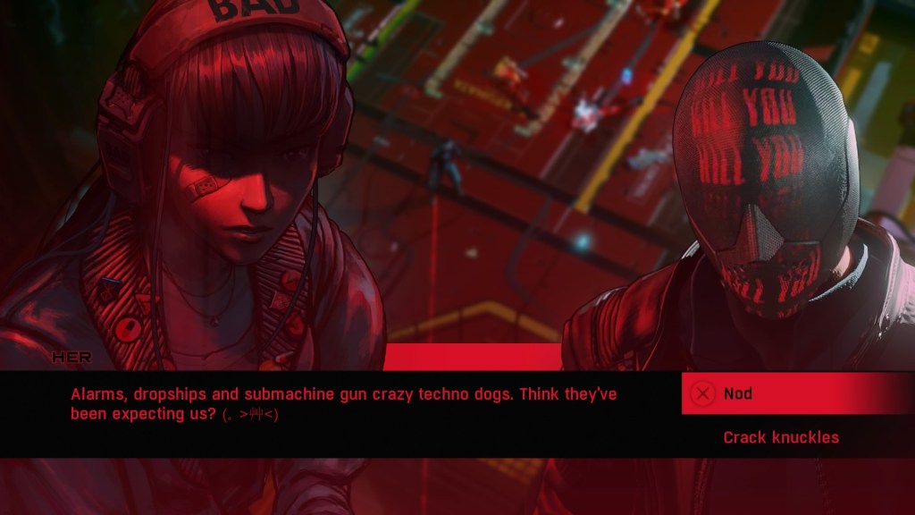 You are a humble masked assassin living in the cyberpunk city of Rengkok, which is pretty much controlled by the Heaven conglomeration. Your cybernetic enhanced body has been hacked and you’re being forced to assassinate the Boss, the leader of Heaven, when your brain gets re-hacked by a mysterious woman simply referred to as “Her.” According to Her, there’s a coup being run against the Boss, and the conspirators has kidnapped your brother to act as additional leverage against you. And so, you embark on a murderous rampage through decrepit facilities and factories, chasing this vague figment of a brother.