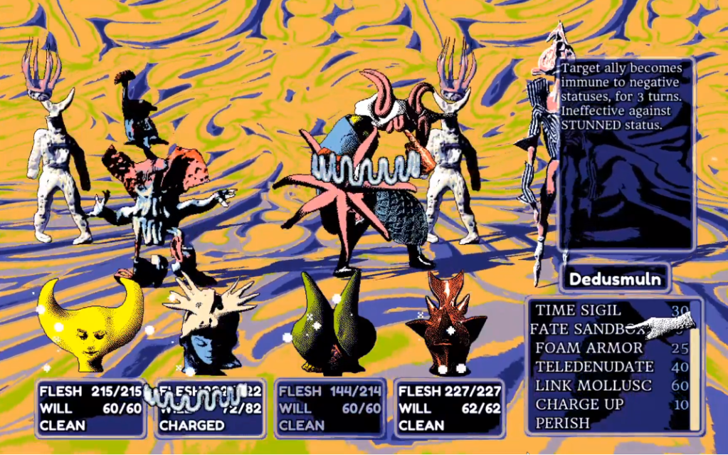 So, speaking of that battle theme above, battles! Battles are surprisingly hard in this game, demanding that you use the most of your resources to get through. Each enemy has a specific moveset and most of them are actually kinda dangerous, so battles come down to figuring out who is the most dangerous enemy in that situation, taking them out, and whittling the rest of the party down from there. One of the worst enemies that you could face – and the ones that makes Hylics 2 a genuinely frustrating experience – are the Poolmen and Poolmagnes. Both are enemies that can consistently replicate themselves, and the latter is worse in that on top of having more HP, they counter every hit a bleed-like skill. Like, my enjoyment of the game just tanks whenever I’m around them.