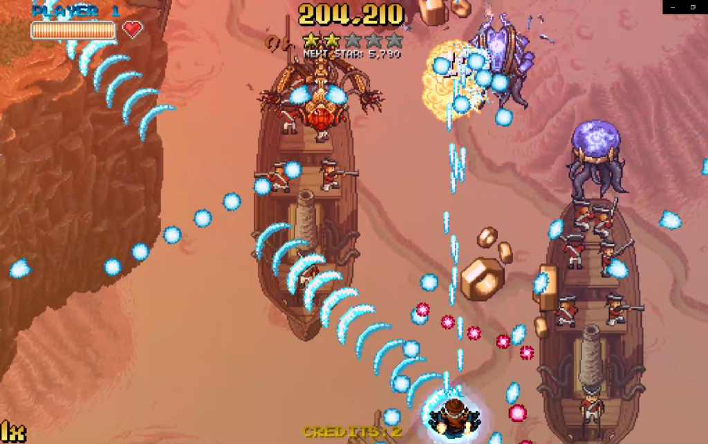 Jamestown‘s equivalent of bombs – and the key to getting high scores – is vaunt. After collecting a certain number of, I don’t know, dubloons, you can enter vaunt mode. Entering vaunt grants a brief shield against bullets and after it’s gone you’re left with an attack power boost for the rest of vaunt’s duration. Any ships you destroy while in vaunt mode nets you extra points and you can sustain vaunt by collecting more dubloons. If you don’t care about score, you can cancel out of vaunt early for another brief shield, and given how fast it is to accumulate vaunt, a defensive playstyle is viable. Overall, vaunt is a neat alternative to bombs that can swing you between aggressive and defensive play.