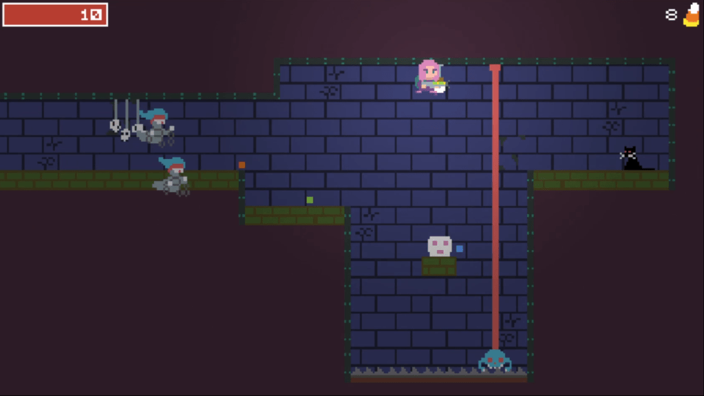 While the game has an open map, progression is mainly linear. You don’t have to backtrack to get past obstacles you never could before that much. There are health upgrades in the form of candy filled pumpkins and an optional quest of petting every cat on the map, but most of them are placed behind standard platforming puzzles that don’t require new powers. To me, it makes for a light version of a Metroidvania experience.