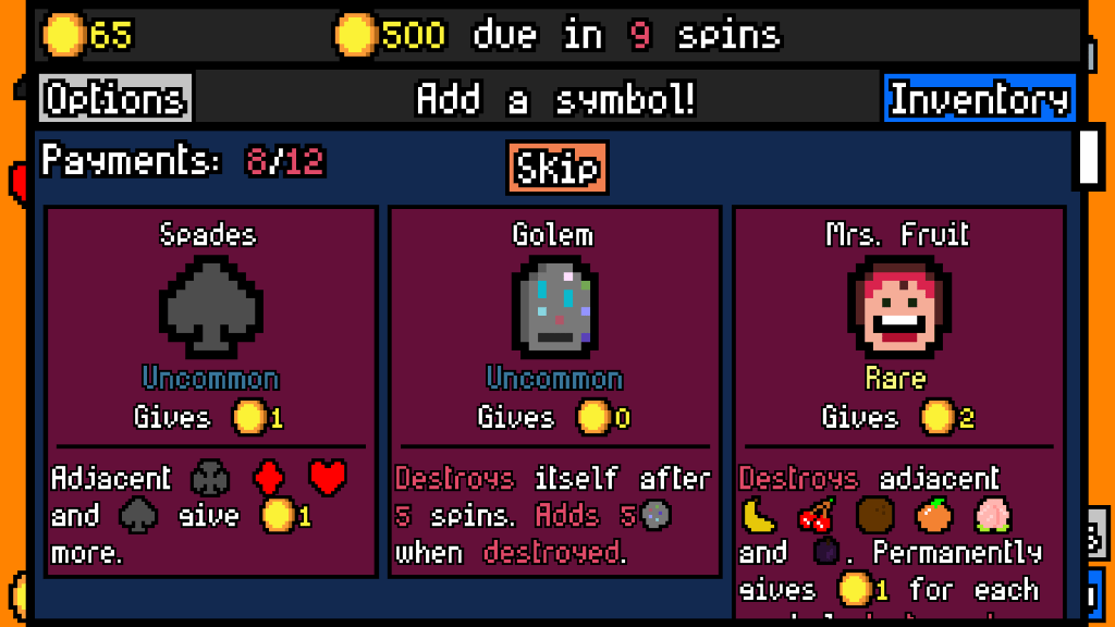 You start out the game with five symbols on the slot machine. Thankfully, you don’t have to line them up, as you’re just paid for each symbol that you roll – though there are plenty of symbols that pay more if they’re adjacent to certain ones. After a pull, you can add a new symbol to the machine, which is where the depth of Luck Be a Landlord comes in.