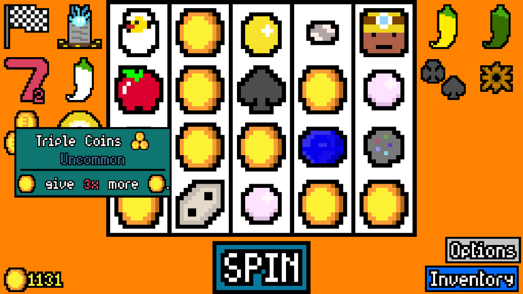Most of the symbols have some kind of gimmick or synergy with other ones to be mindful of. For example, the Snail symbol does not pay out for the first 3 times you get it in a pull, but it will pay 5 coins the fourth time it shows up. But, you can make it better by getting the Checkered Flag passive item, which reduces the timer effect for some symbols by one turn. And from there, you may as well pick up other things that could vibe with the flag. Like the Owl, who normally pays an extra coin every three spins, whose normal pay also increases with a passive that benefits bird symbols or by being adjacent to a Moon symbol in a pull.