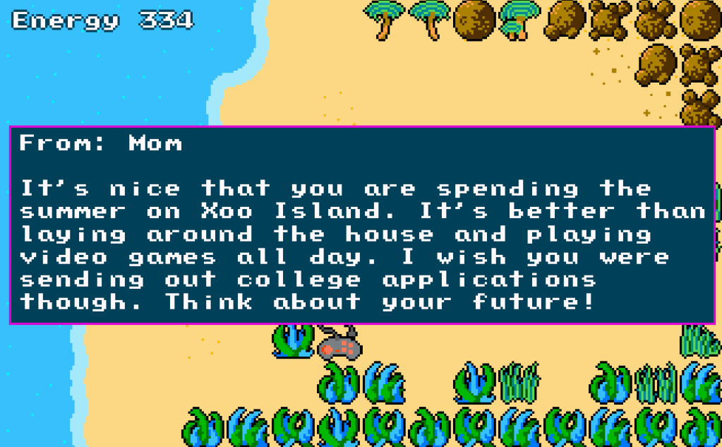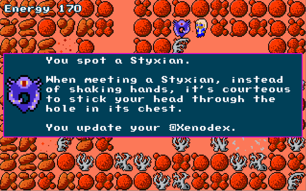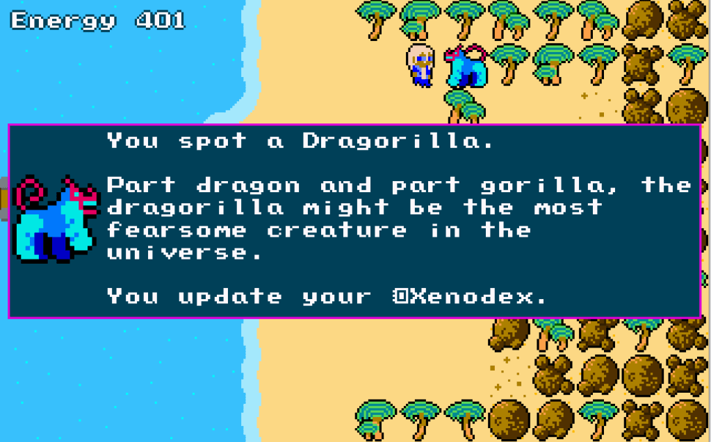 The game has a really nice, bright look to it that brings a happy mood to your adventure. Though, the colorful yet mundane setting of the game is contrasted by the xeno designs. Each xeno has a unique look, from strangely colored versions of animals that we know and love, to the more alien and bizarre. Not to say that the developer skimped out on other areas, but it clearly feels that a lot of the art focus went into the hundreds of xeno sprites you’ll come across – which is fine by me! Also, I really love the music for the game. The game uses music made by Amiga Deluxe, repurposing their chiptune music into this island adventure. It really gives a peppy high energy vibe and a chill vibe simultaneously that I was really into, and I’ll be honest when I say that I left the game on in the background when I was doing something else at one point just to listen to the music. If you’re into nice chiptunes, you’ll be right at home with this game.
