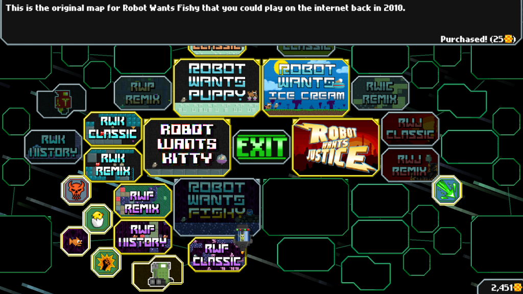 What I got was a testament to what compilations like this could be. They put in the original games, but they also provided easier and harder variants of all the games. They also added unlockable cheats, game modifiers, different robots to play as with special abilities, as well as an entire new Robot Wants game. It’s honestly still difficult to believe this much work, this much love, went into what could’ve been a simple compilation of five games.