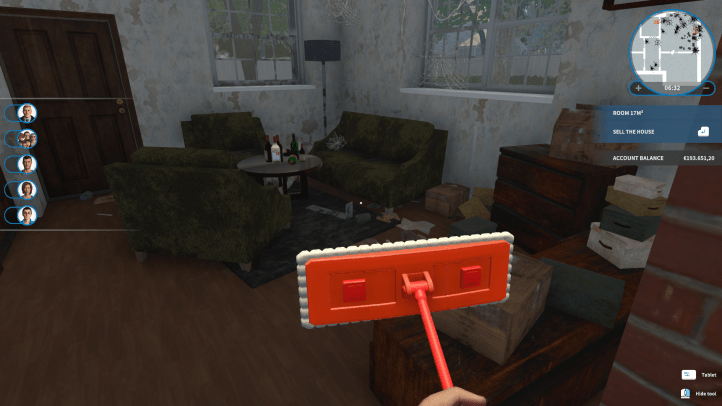 Well, except for the panel of buyers to the left. As you fix up a house, these people will chatter about their various wants and things they hate. The person at the top is the one that will win the auction when you put the house on sale, and whoever’s in that slot is likely to shuffle around as you furnish and decorate rooms.