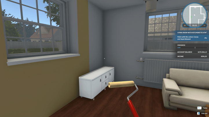 But here’s the thing though: the tediousness works. Sure, in something like The Sims, a painted wall would be done in an instant. But there’s little work put into it. There’s no sense of satisfaction besides, “hey you have a painted wall.” House Flipper however makes you put in that work, finishing a wall bit-by-bit. While slow, it gives a sense of purpose toward coloring a wall. Whenever I finished painting or tiling over a room after a few minutes, I can look at it all and think “I did this.”