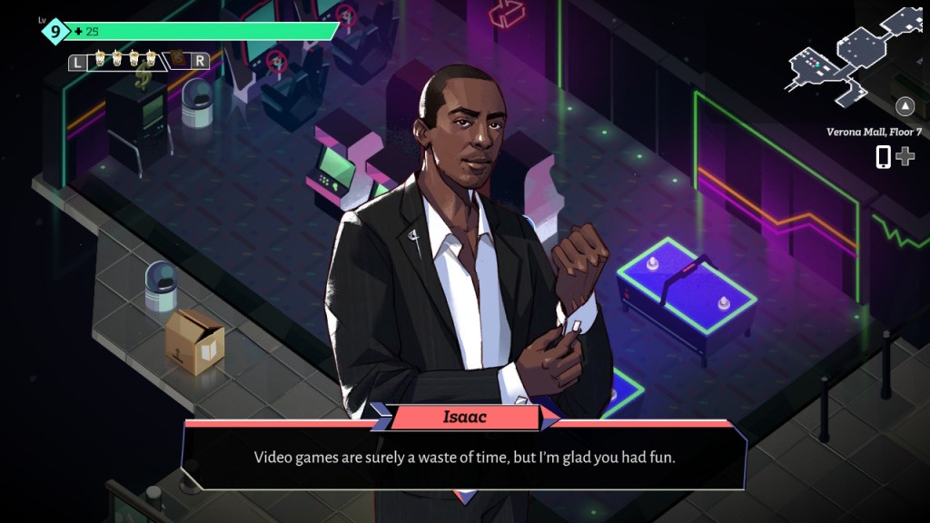 Your starting weapon is Isaac, the guy that your cousin requested to help teach you the ways of the dunj. He is a realistic good rich person in that his sincere desire to use his wealth to actually help people screws him over. Like my man, we have to fight your dad (you unfortunately don’t). I actually think Isaac is admirable because you don’t really see black guys as the default first option in games with dating elements a lot, if at all. Probably my second favorite character.