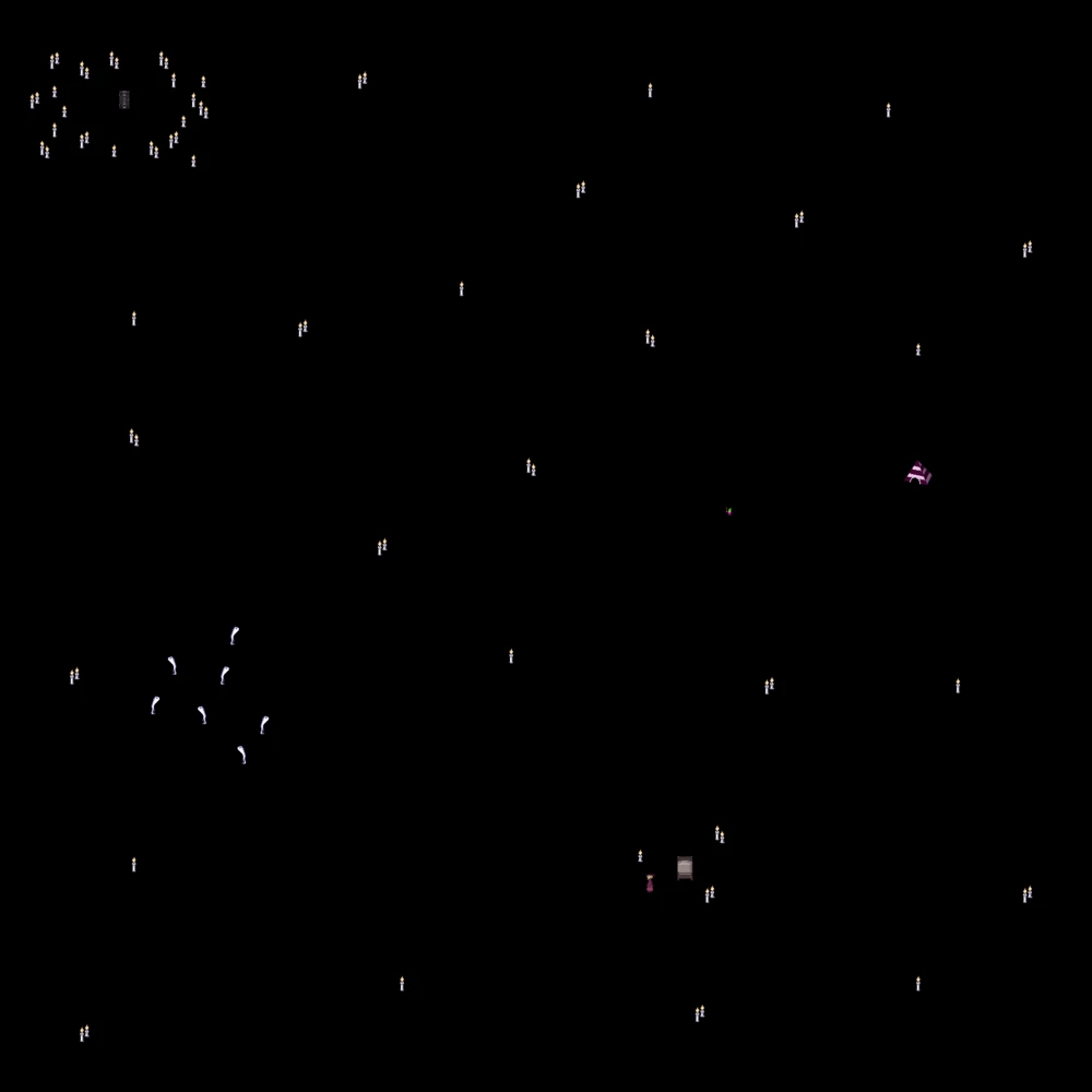 The above shows the area aptly dubbed “Neon World”. Yume Nikki is a game with a lot of odd looking creatures or objects, whom I refer to just as “guys”, because they are endearing to me (when streaming the game I would often say things like “Oh… look at this guy!”). Neon World, in particular, is absolutely full of guys: there are a few types, including the squiggly fellow at the bottom and what looks to be a living arcade machine near the upper left. In this entire menagerie, however, there is only one guy who is visually unique, and who will grant the player an effect upon interacting with them. The full map is quite large, but can feel crowded with all the guys moving around, so this collectible can be easy to miss.