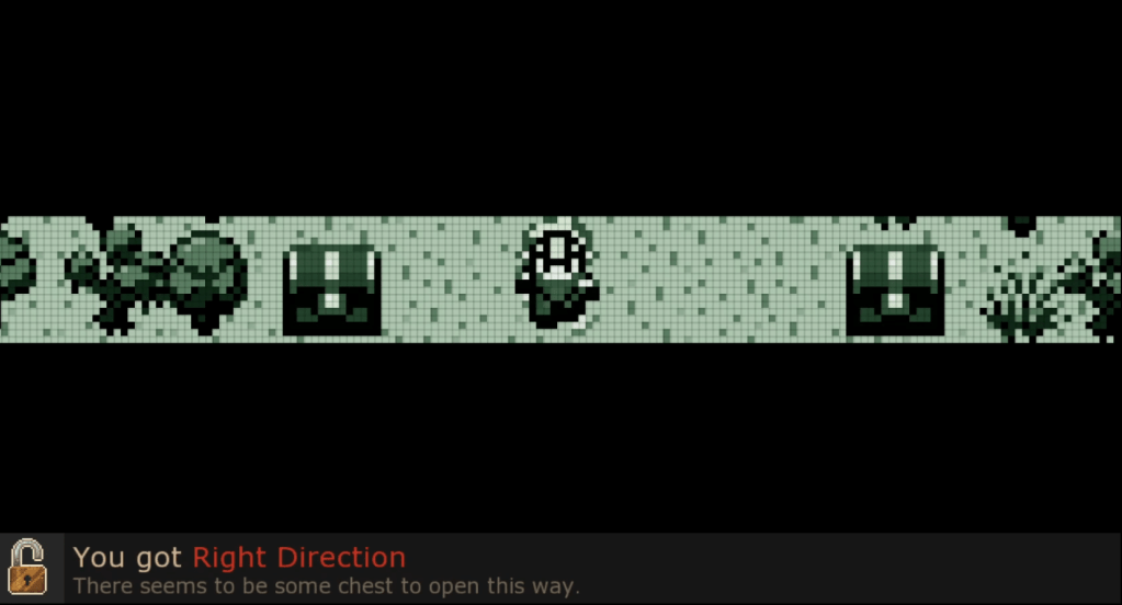 You start out in a basic monochrome area, only capable of moving right. You do so and open a chest, which grants the ability to walk left. Another upgrade and the screen expands. Another one and a new mechanic in the form of a sword to swing is introduced. Another and sound is properly added to the game, then color. All the while, pop-up notifications make all the relevant quips, like some observational video game webcomic.
