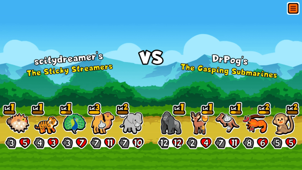 When planning is finished, your animals head off to battle. You fight with a roster of up to 5 animals. Unless you or your opponent have the few animals that can strike randomly as an ability, combat will have animals at the front of the rosters clash against each other, with the next animals in line moving up when the one ahead is defeated. This goes on until only one team is standing… or none. You can get tied rounds, which can actually be pretty advantageous if you have an animal that buffs itself or others over time. I’ve said this before, but I like playstyles where you slowly grind enemies to death over time because it’s always satisfying when it’s pulled off, so it’s a win for me.