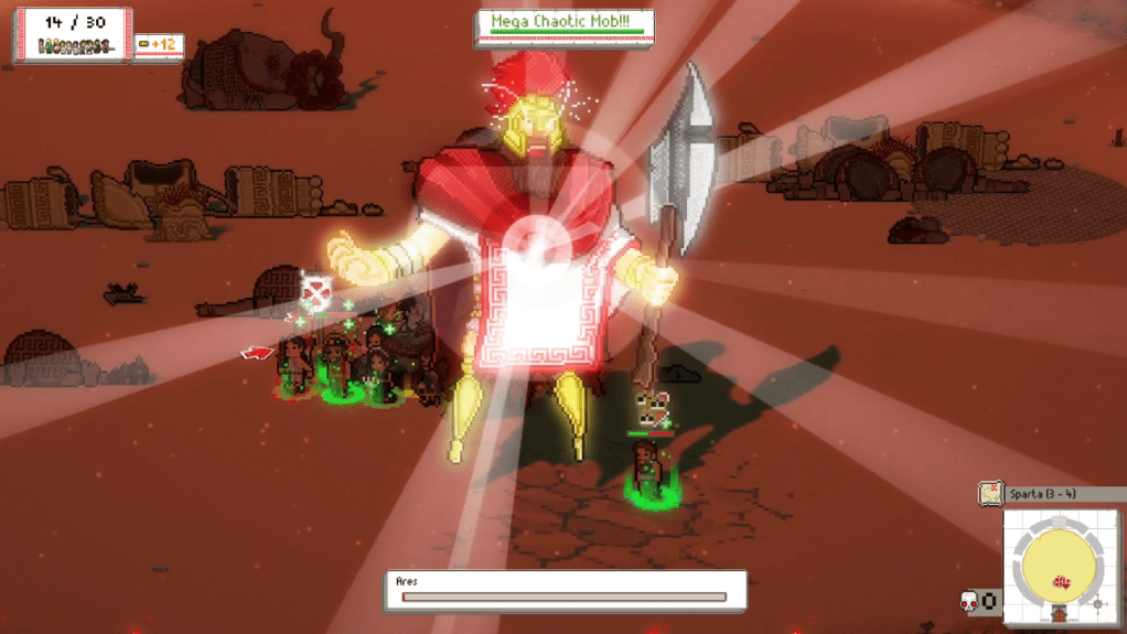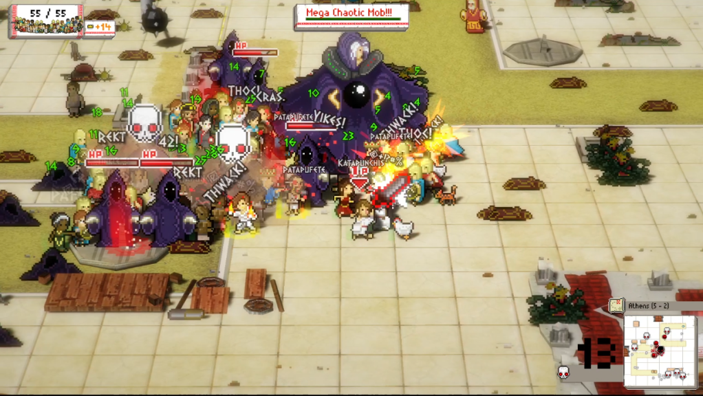 You control a philosopher, who has the unique ability of leading the mob. Any other philosophers that join up essentially act as extra lives if your player character philosopher dies. There are average citizen individuals, there are defenders that can take more of a beating, attackers that help carry the damage dealing and (looks at notes) slaves? Seems weird to be fighting authoritarian gods while still having slaves, but as the fucking nerds say, change is a marathon not a sprint or some shit. Anyway, the slaves are also unique units in that they carry the game’s active items, which does handy things like summoning helpful ghost units out of thin air and healing everyone in the mob.