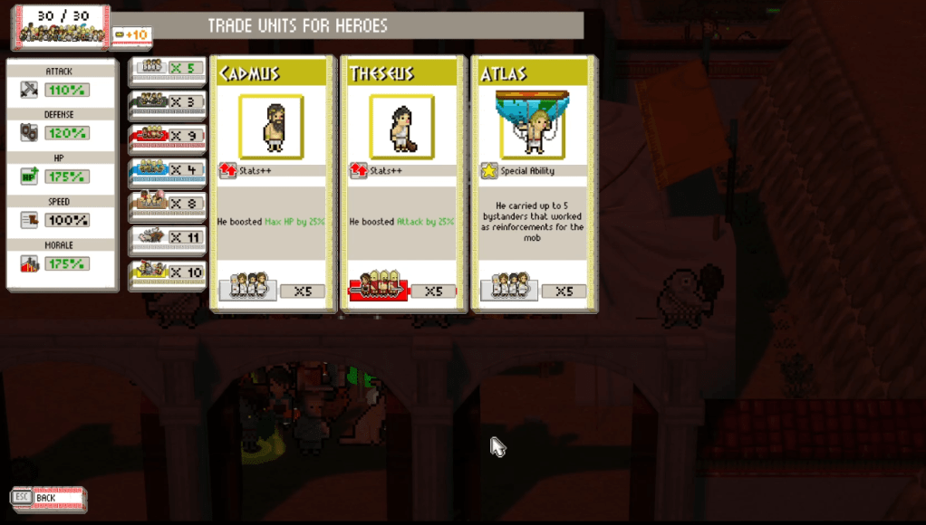 The shop is the place where you’re most likely to acquire hero units. Heroes are a range of classical Greek figures (real and mythological) as well as pop culture references renamed to be more Greek-sounding. I actually kinda hate it. Ready Player One-ass content. Also, how dare you have a “this is Sparta” joke at the start of the Sparta level? That was old even by 2016 standards.