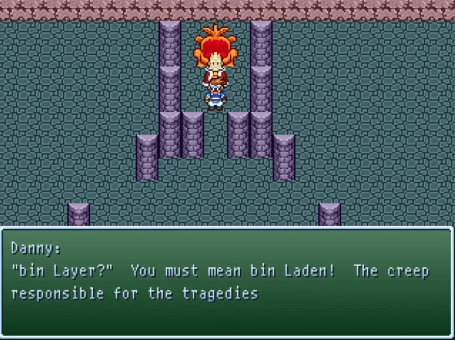 You are Danny and I guess the plot is that he was isekai’d into a fantasy world along with his girlfriend, Jenny by some temporal villain. Or maybe they were sent into the past, can’t tell. He finds that a nearby town is being hassled by terrorists and an almighty Terrorist Captain. As it happens, not only were the heroes brought into this world, but so has fucking… Osama bin Laden. It’s incredible.