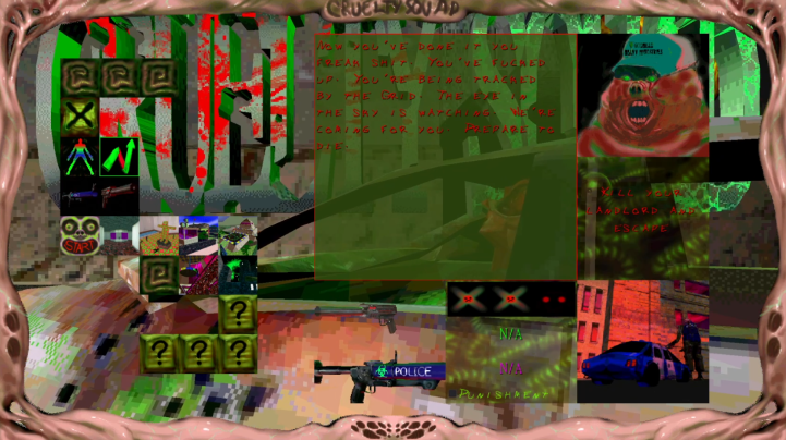 The game’s visual identity is apparent before starting the game proper, with a title screen of a messed up looking corpse inside of a simple yet grossly-textured car while 3D word art of the game’s title is splashed awkwardly over it, all framed within a weird UI picture frame. Going into the actual game is hardly any better, with a world that’s utterly grotesque and off-putting – but deliberately so.