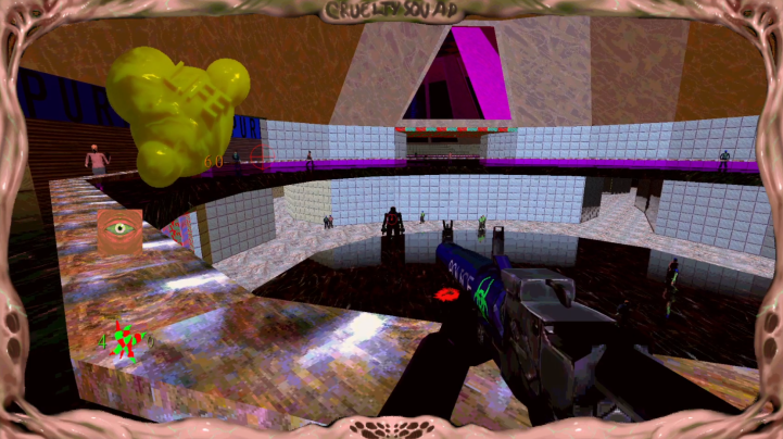 The creator himself posted the above picture and I feel that it’s actually a pretty apt description. The levels in Cruelty Squad feel less like shooter levels and more like big open platforming levels – especially a particular endgame one. It really does feel like you’re being plopped into Mario 64 levels, or in some cases, setpieces in surreal walkaround games in the vein of LSD: Dream Emulator that shows up pretty often on itch.io. This disconnect between levels and the actual genre helps fuel the game’s uncanny feel – especially since it all actually works.