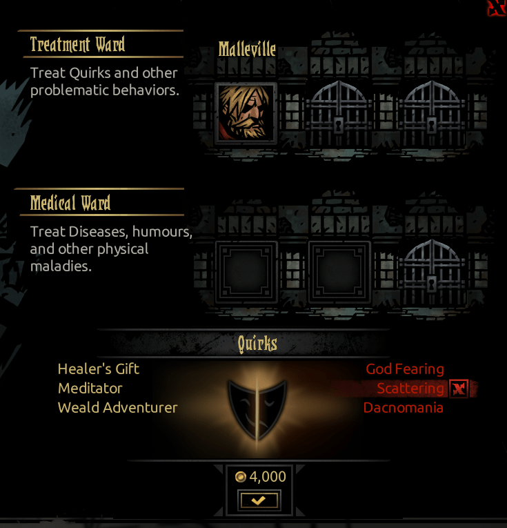 While Mantel got really stressed out toward the end, the first outing into water world was a success. However, I was hit with a new worry when I took the time to review everyone’s quirks. Malleville got the handy quirk of Scattering, which lowers his ranged attack – and unfortunately, all of his handy moves are ranged. That got me thinking that I should get him sent to the eugenics hell of the Sanitarium to deal with that and oh on god? This place is this expensive??