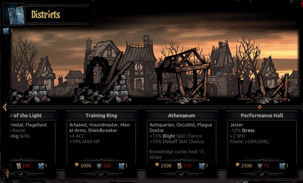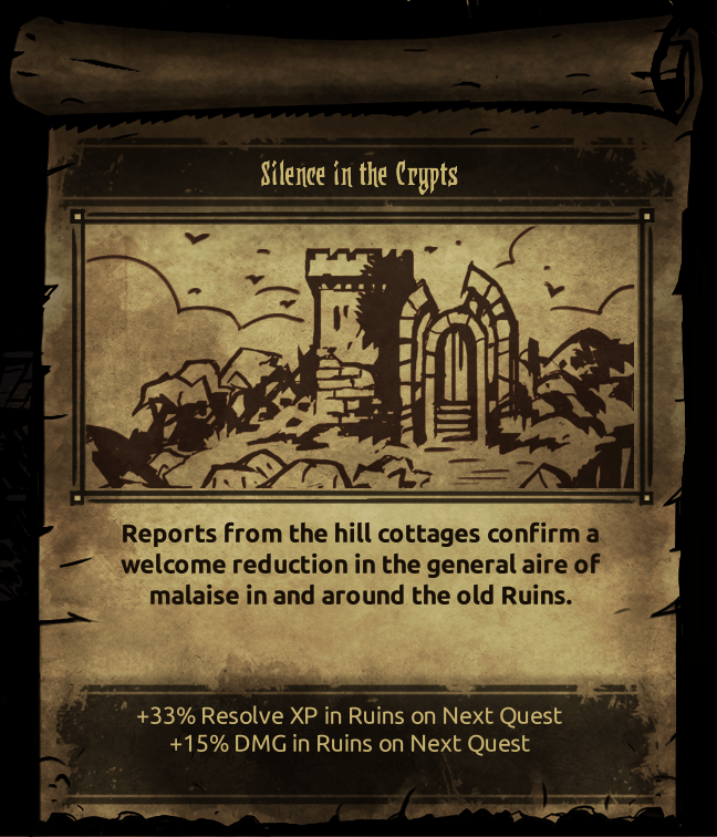 But something else was on the run: a horrible Necromancer Apprentice was spotted in the Ruins. It sounded like boss time, so it was off to the ruins. to the Ruins. Reynauld, Cairon, Couci and Cambrai banded together for this mission, getting branded as “Witch Hunt,” which is sick. Since this mission was more serious and I didn’t really need to spend money on stress relief at the time, I decided to upgrade everything I could. Well, I couldn’t upgrade anything on Cambrai since she was fresh, so she wound up getting paid in experience.